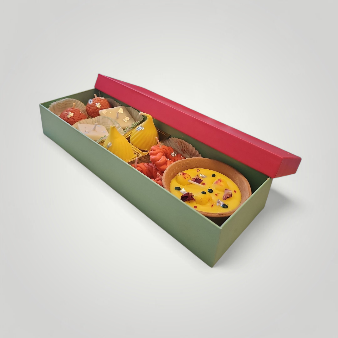 Light up your celebrations with our Mithai Candle Box – a delightful assortment of candles crafted to look exactly like your favorite Indian sweets which is a feast for the eyes and a treasure for the home. Each piece is carefully handmade with fine detailing, topped with silver vark and festive charm, making it the perfect Diwali gift, return favor, or centerpiece. Celebrate the festival of lights in the sweetest way – with candles that look good enough to eat but are made to glow!