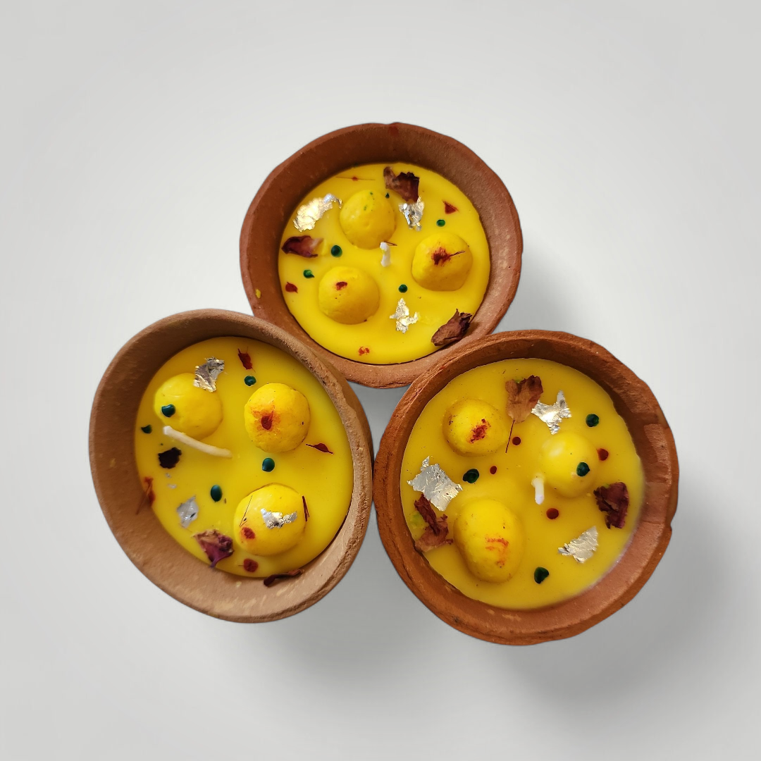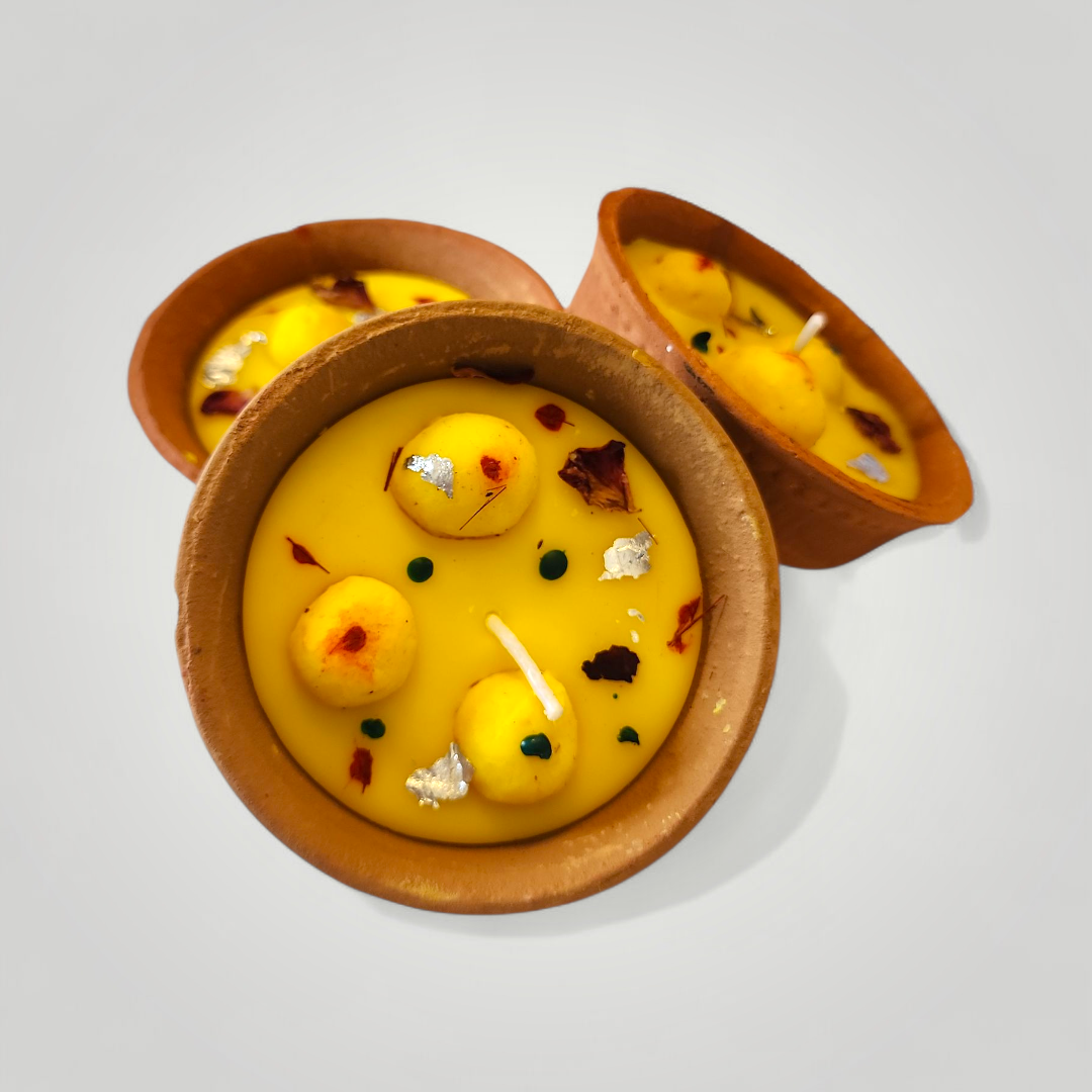 Indulge in the sweetness of tradition with our Rasmalai Candle, a handcrafted masterpiece that looks just like the beloved Indian dessert served in a kulhad (clay pot). Made with exquisite detailing – from the creamy saffron yellow base to the delicate rasmalai balls, sprinkled with pistachio, rose petals, and silver vark – this candle is a true feast for the eyes. Perfect for Diwali décor, festive gifting, or as a centerpiece, this candle blends cultural charm with a warm glowing light. Surprise your guests with this realistic dessert-inspired creation – they’ll do a double-take before realizing it’s a candle!