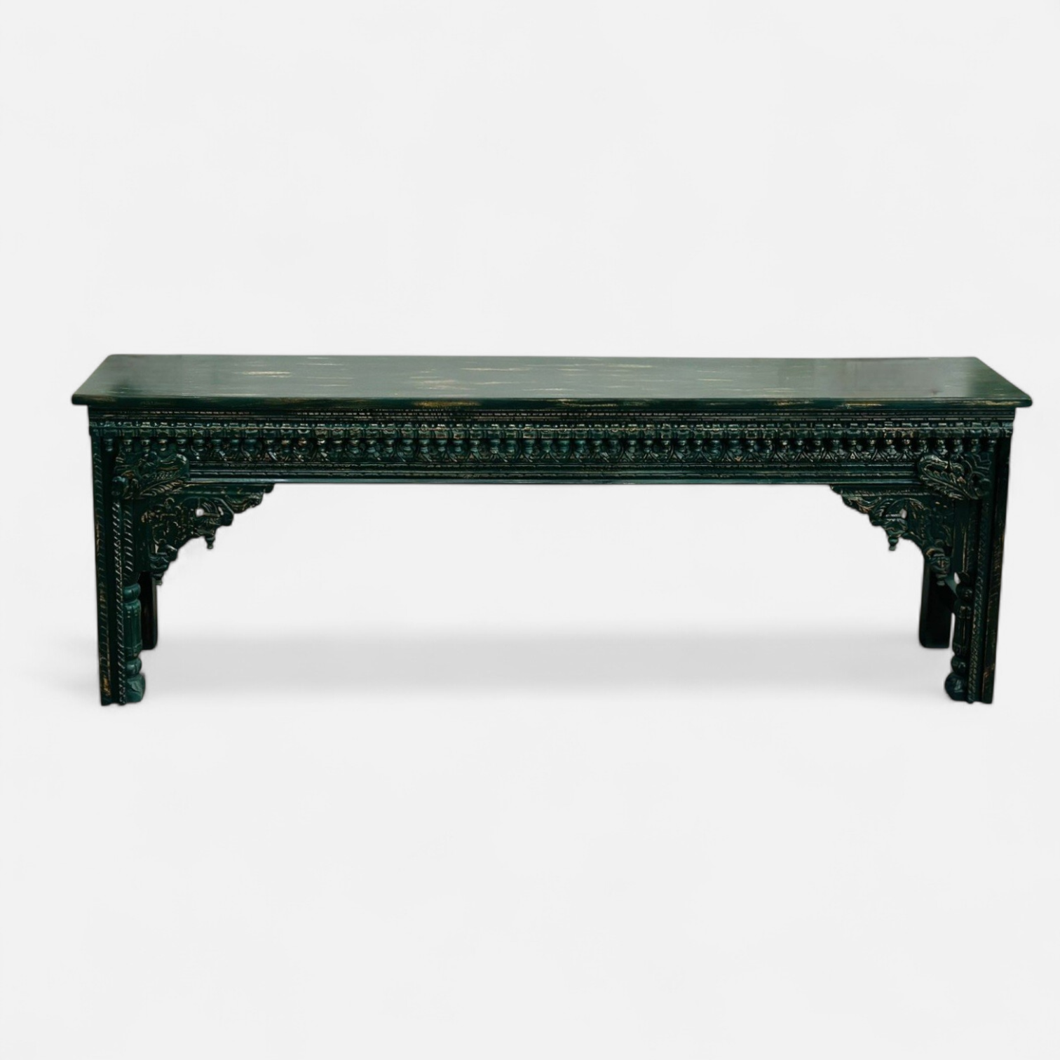 Finished in a deep emerald green tone, the console exudes richness and sophistication while highlighting the delicate carvings. The bold colour paired with traditional craftsmanship creates a striking statement piece that elevates both modern and classic interiors.