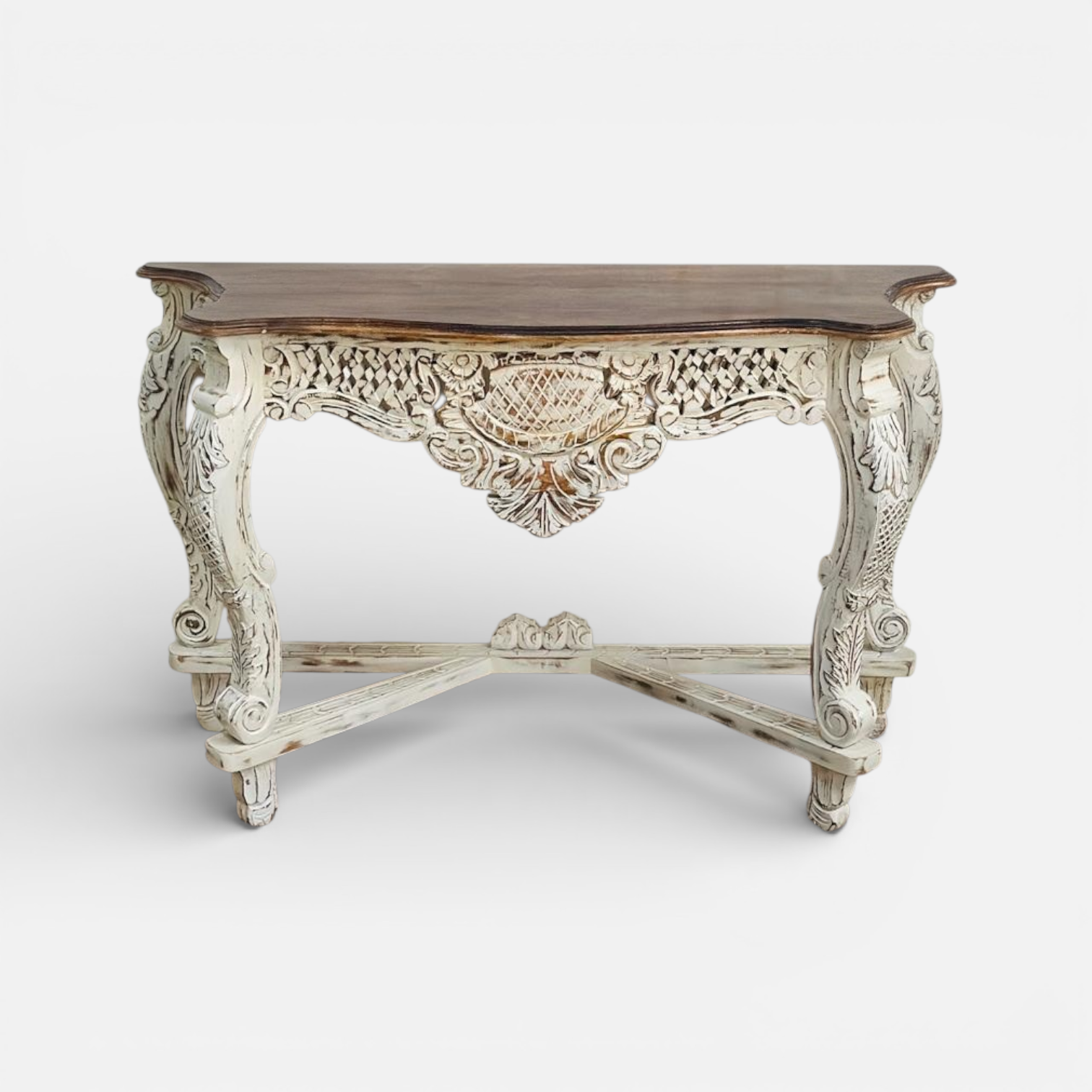 Finished in a distressed ivory tone with a contrasting natural wood top, the console exudes vintage charm while highlighting the depth of the hand-carved patterns. The gracefully curved legs and cross stretcher base add structural elegance while enhancing its regal character.