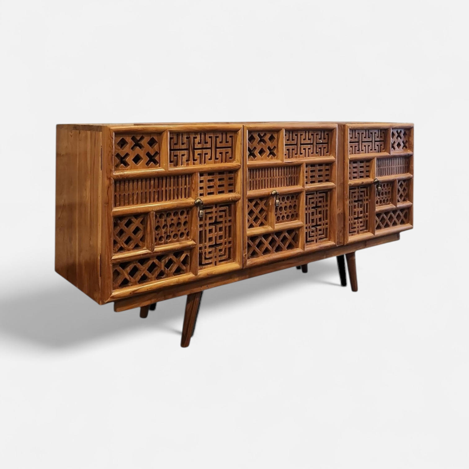 Our handcrafted sideboard showcases a striking mosaic of carved geometric panels, each section featuring a unique lattice or patterned design. The intricate arrangement of patterns creates depth and visual texture, celebrating the artistry of traditional woodworking.