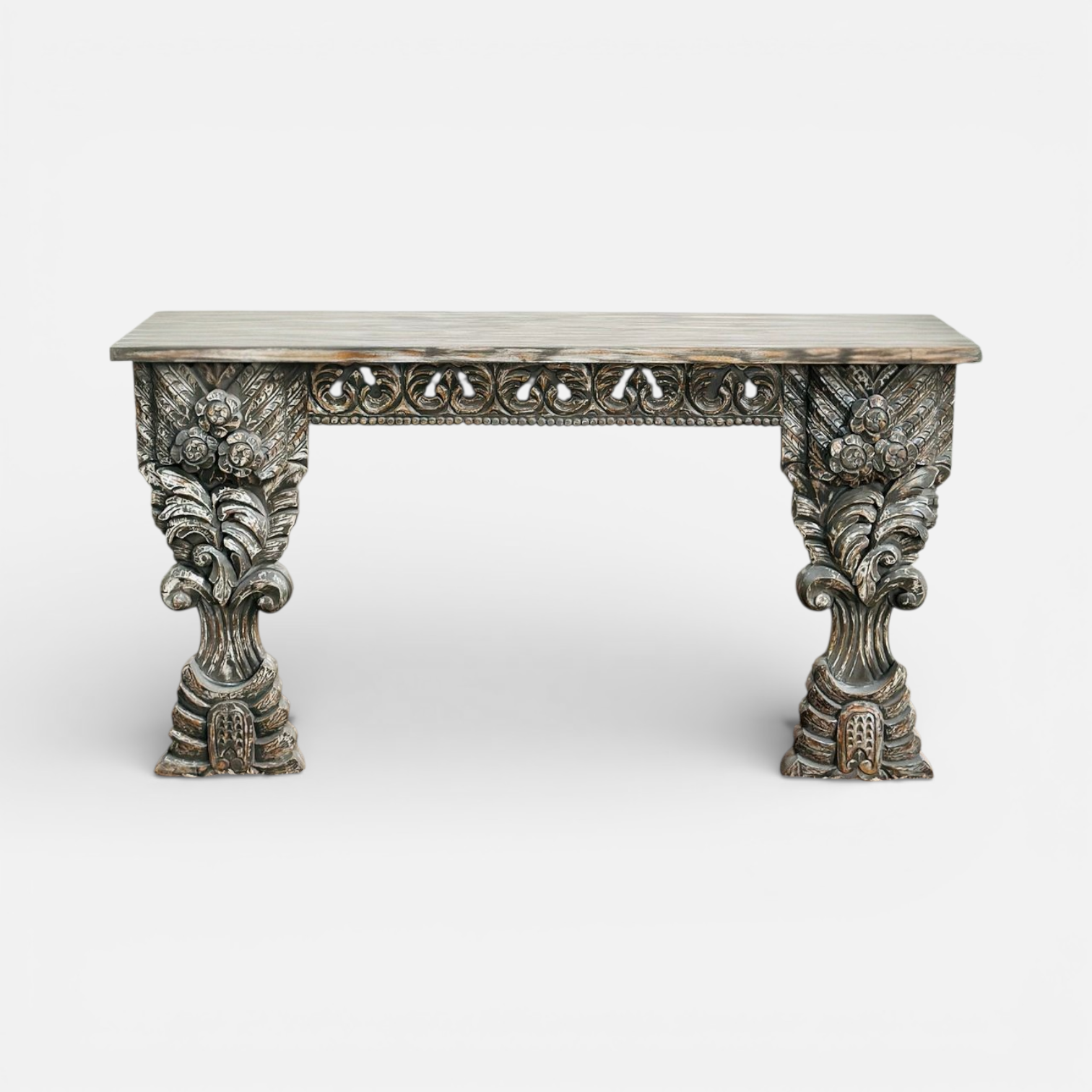 Crafted from solid wood and finished in a soft distressed tone, the console highlights the depth and texture of the hand-carved patterns. The elegant floral motifs and decorative apron bring a sense of heritage charm, while the clean rectangular top balances the ornate base.
