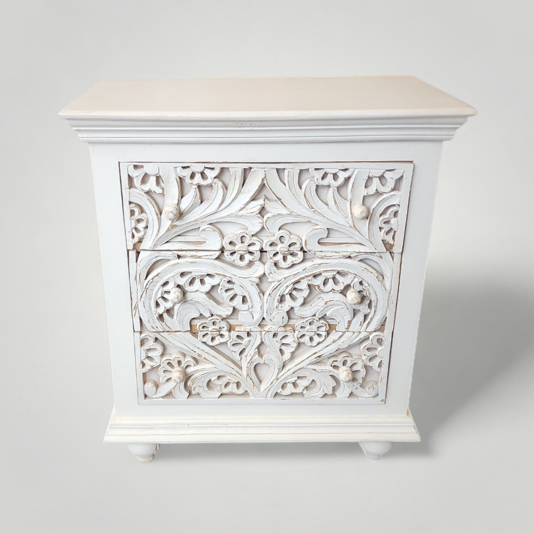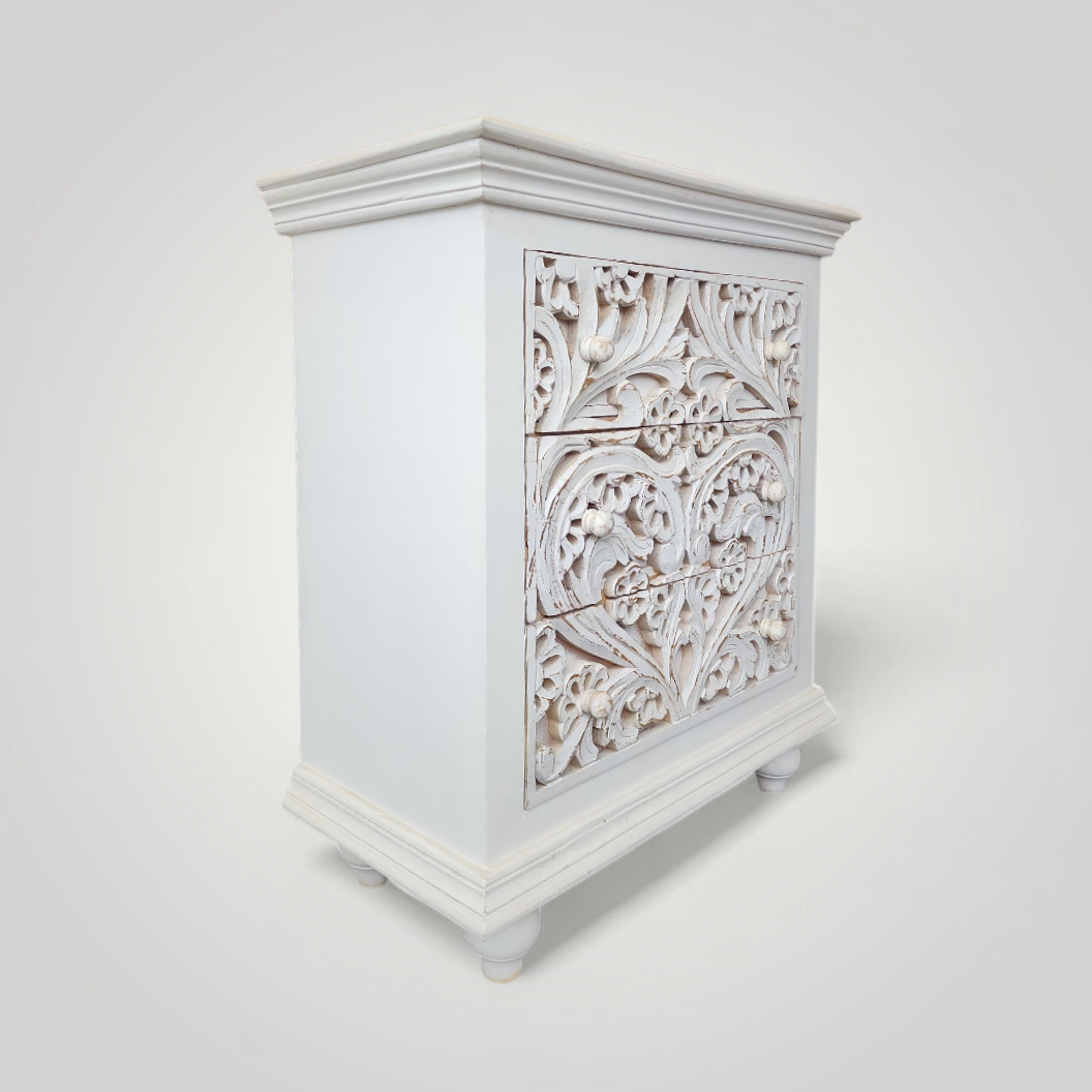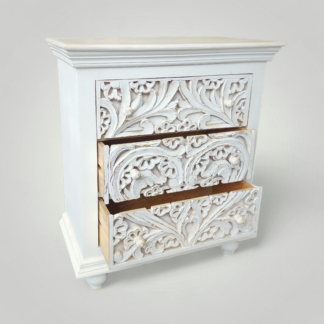 Add elegance and handcrafted charm to your interiors with this beautifully hand-carved wooden chest of drawers. Featuring three spacious drawers, each panel is intricately carved with floral and vine motifs inspired by traditional Indian heritage designs. The delicate craftsmanship gives the piece a refined artistic character while maintaining its practicality as a storage solution.