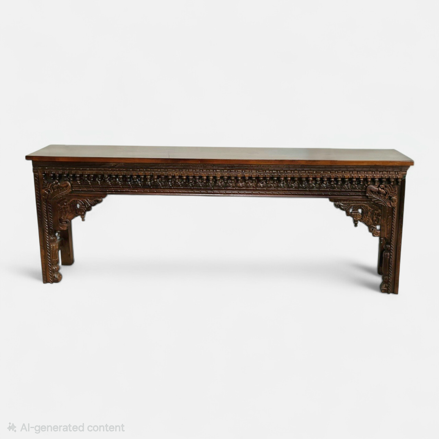 The rich dark wood finish enhances the depth of the carvings, giving the piece a warm and luxurious presence. Its long, elegant silhouette creates a striking visual statement while maintaining a refined and balanced design.