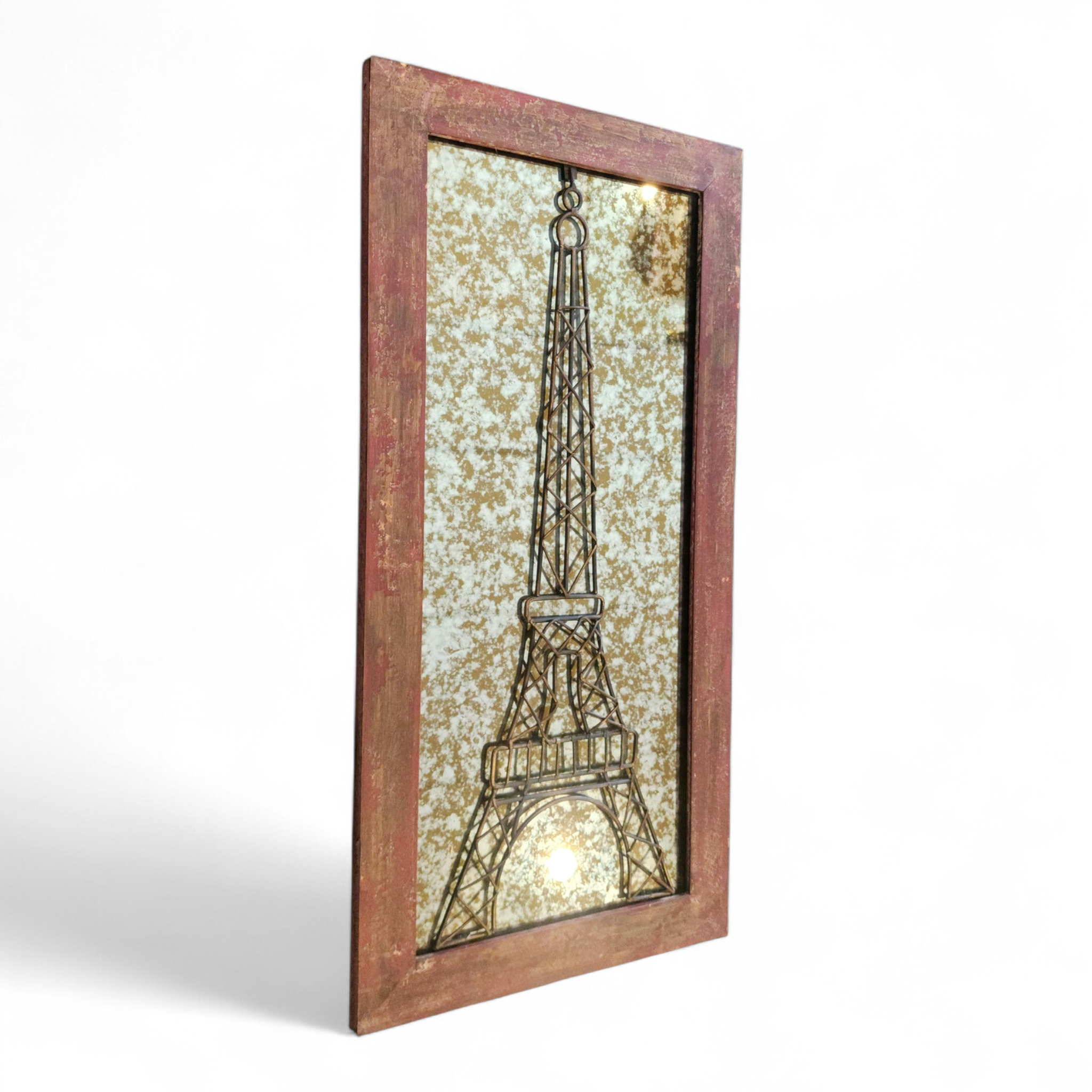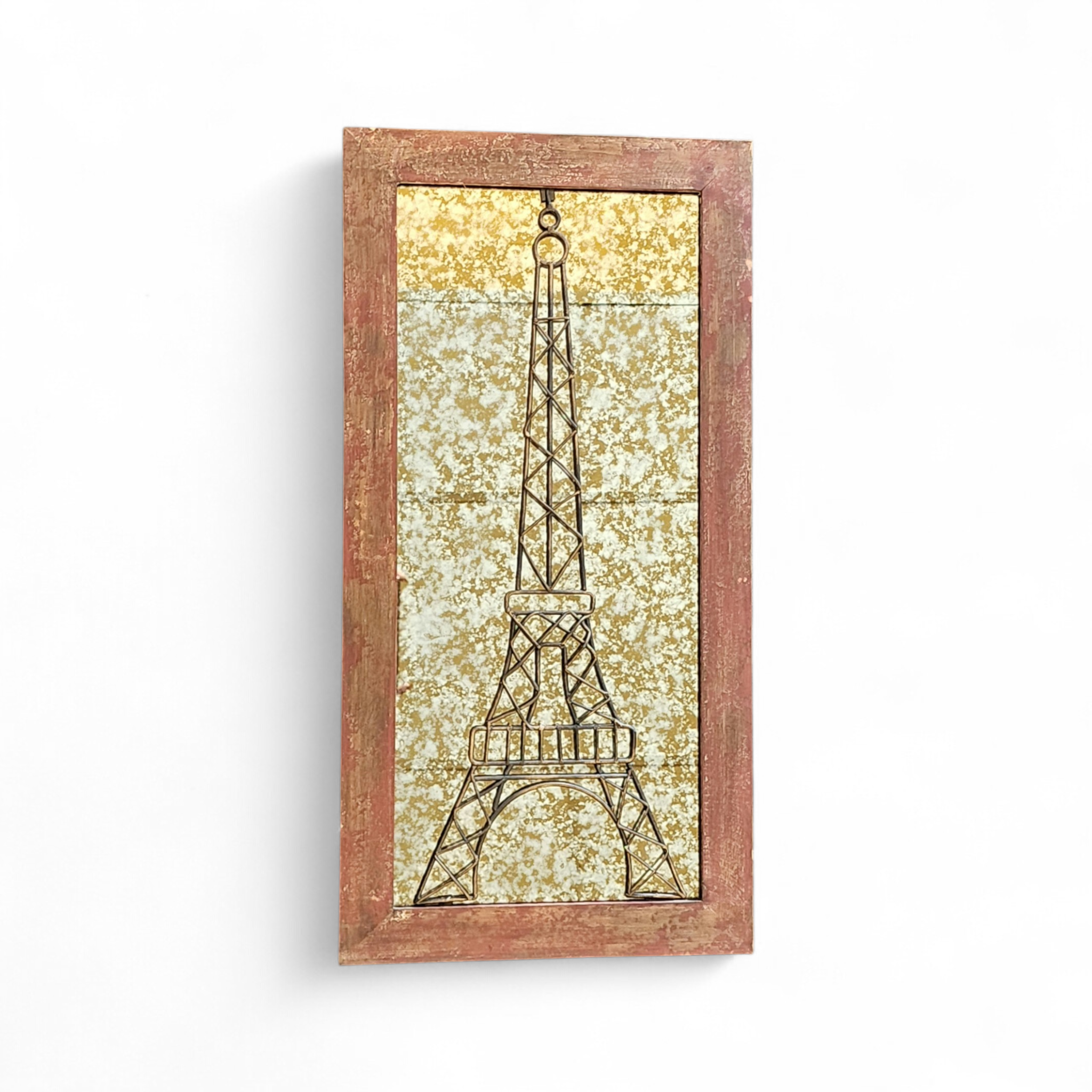 Add a touch of vintage European charm to your interiors with this unique Eiffel Tower wall frame. The artwork features a beautifully crafted metal outline of the iconic Eiffel Tower, placed against a textured antique-style mirror background that enhances its rustic and vintage appeal. The aged mirror finish creates depth and reflection, giving the artwork a distinctive character.