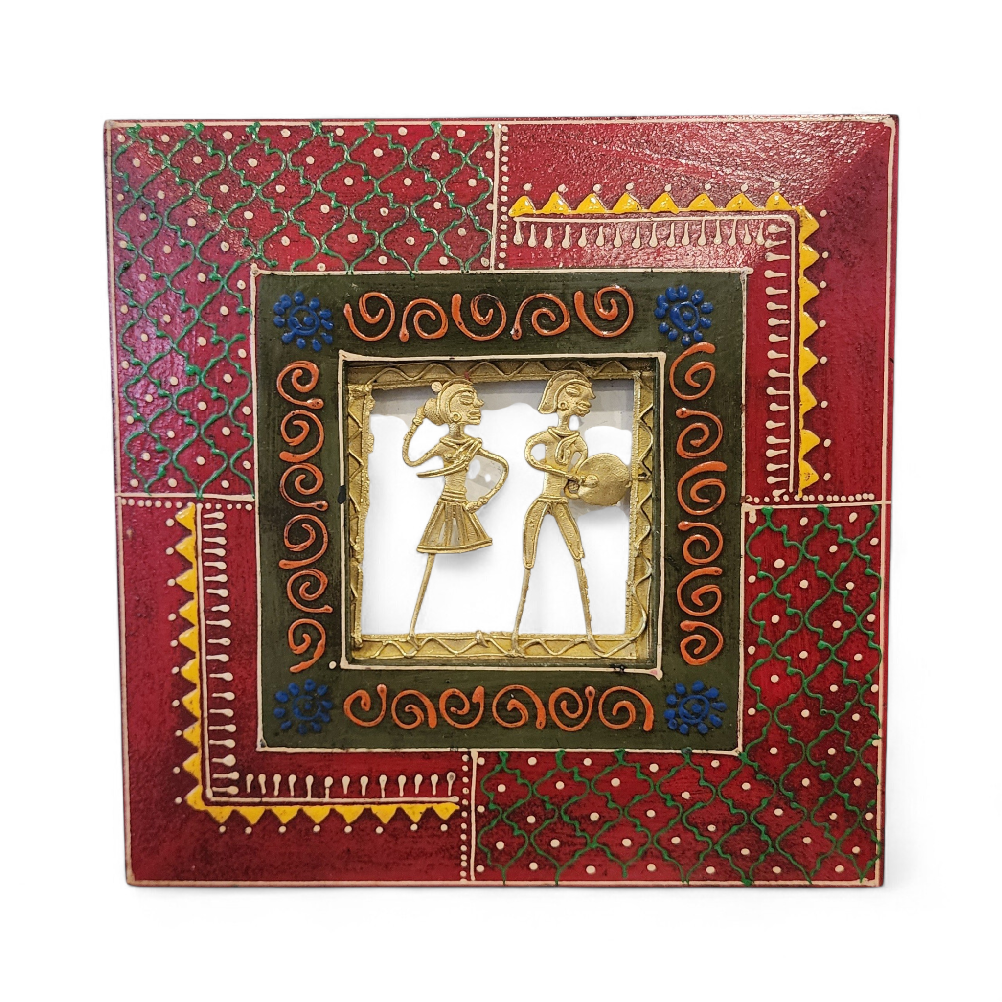 Bring the vibrant spirit of Indian village celebrations into your home with this handcrafted Warli-inspired wall frame. The centre of the artwork features a beautifully detailed brass tribal couple, where one figure appears to play a traditional instrument while the other dances, symbolising music, celebration, and the lively rhythm of folk culture.