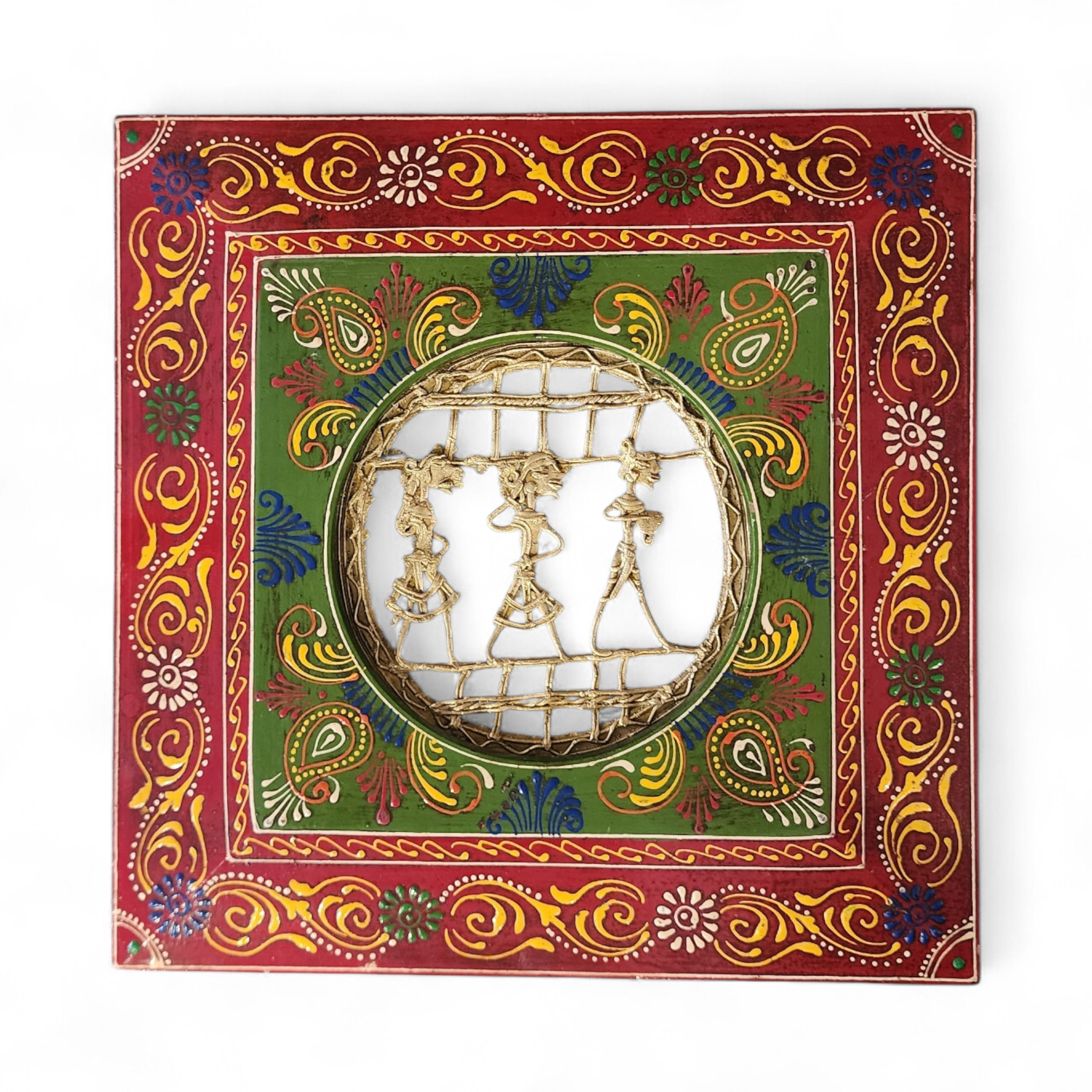 The vibrant red outer frame is detailed with intricate hand-painted folk motifs, while the rich green centre panel surrounds a circular composition of delicate golden tribal figures that create a striking focal point. The colourful patterns and handcrafted detailing reflect the storytelling simplicity that makes Warli art one of India’s most recognised tribal art traditions.