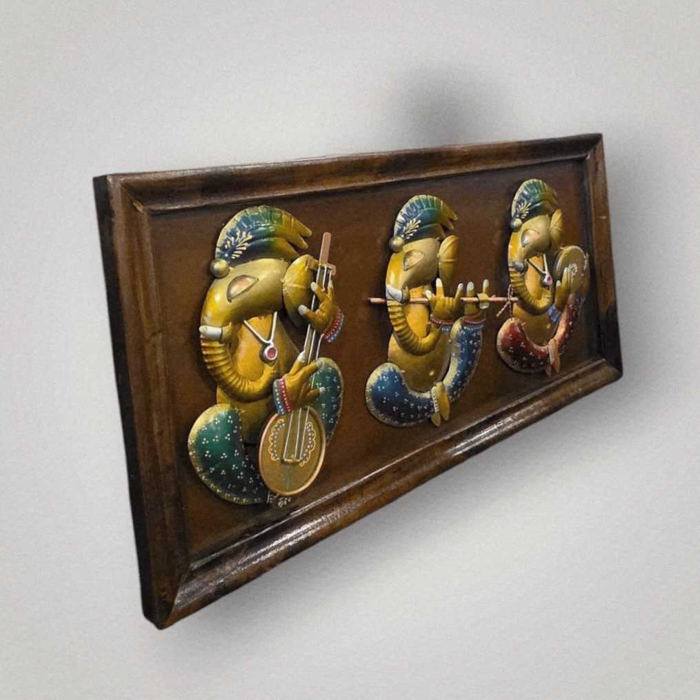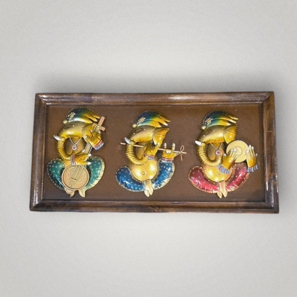 This stunning wooden wall frame exudes spiritual elegance and artisanal charm, featuring three intricately crafted metal Ganesha idols mounted at its center. The rich, warm-toned wooden backdrop creates a sacred aura, enhancing the divine presence of Lord Ganesha, the remover of obstacles.