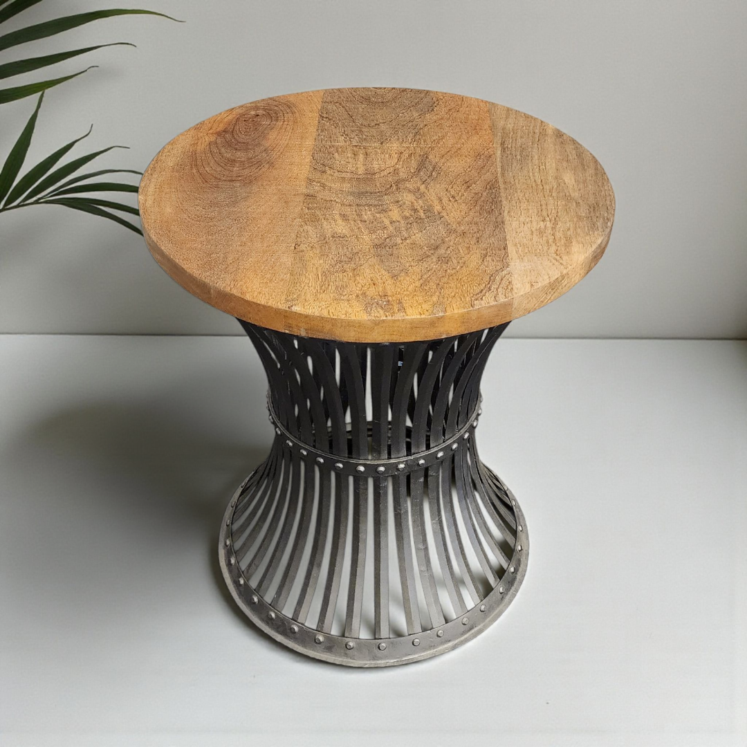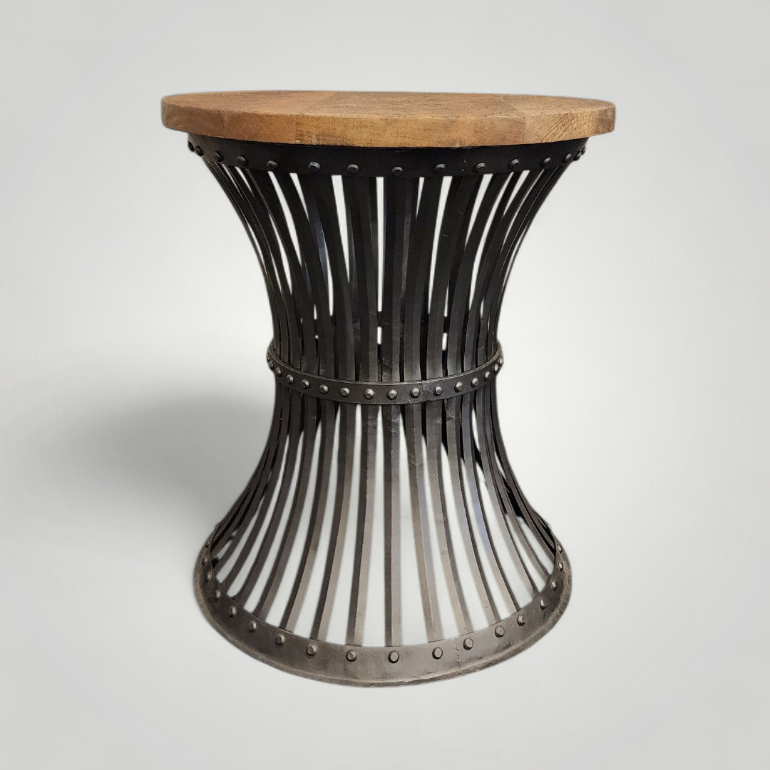 Bold, modern and beautifully grounded — the Aariya Black Cage Accent Table brings sculptural character to every corner of the home. Featuring a smooth natural wood top with organic grain patterns and a strong metal barrel base finished in matte black, this piece blends industrial strength with warm rustic charm. The curved cage silhouette adds an airy, contemporary look that elevates any décor style. Whether styled solo or paired with your other Studio Red pieces, this table instantly adds texture, contrast and designer appeal.