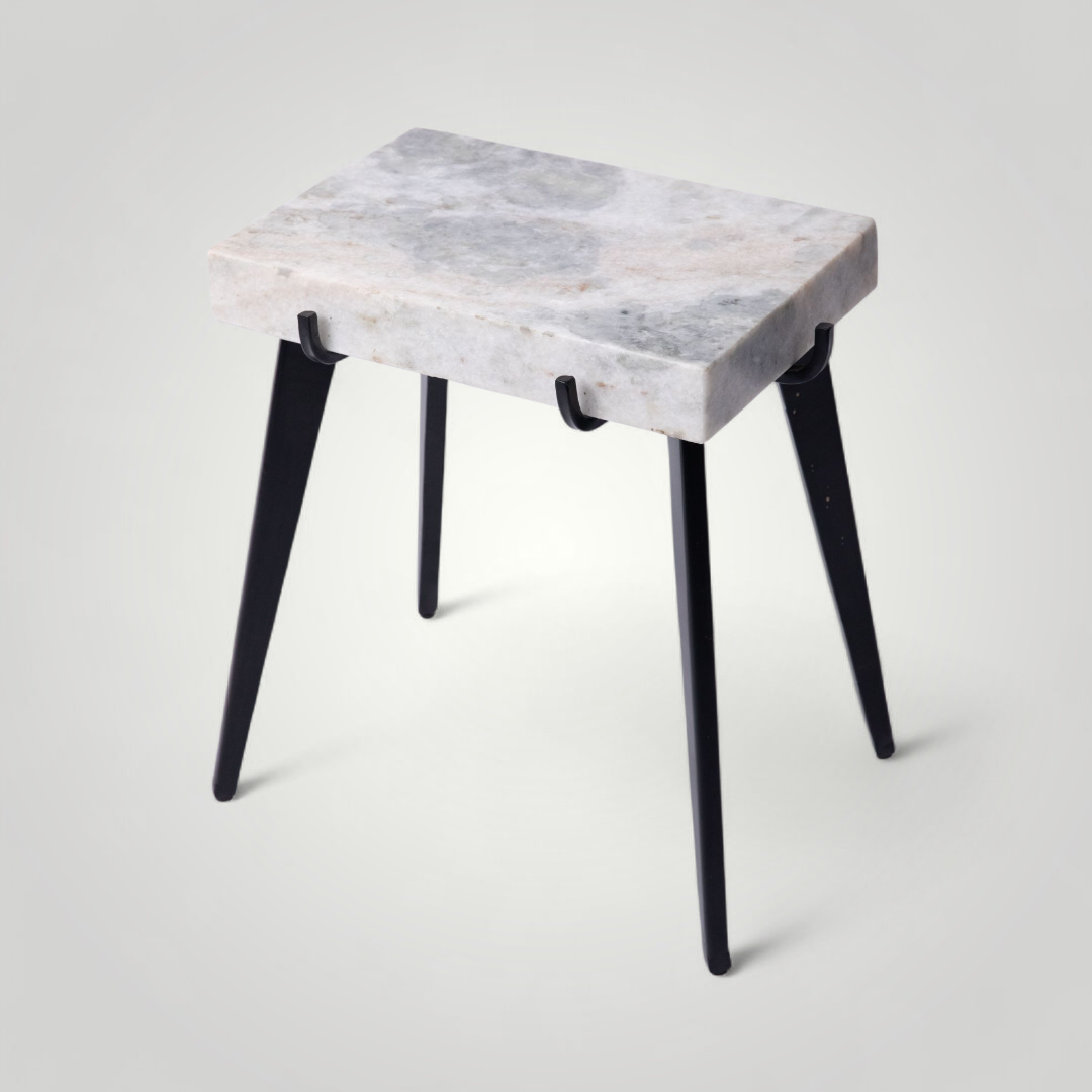 Timeless, minimal, and effortlessly elegant — the Astra Marble Accent Stool brings modern luxury into any space. Crafted with a solid white marble slab and paired with matte black iron legs, this piece beautifully blends natural stone with industrial strength. Its clean silhouette makes it versatile and functional. The subtle grey marbling on the stone adds a soft organic texture, making each piece unique in character and pattern. Small in size but big in style, the Astra Stool complements contemporary, Scandinavian, minimalist, industrial and luxury interiors seamlessly.