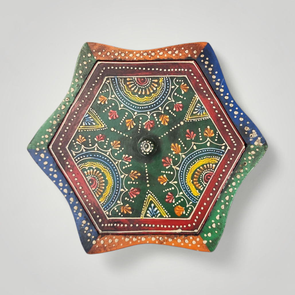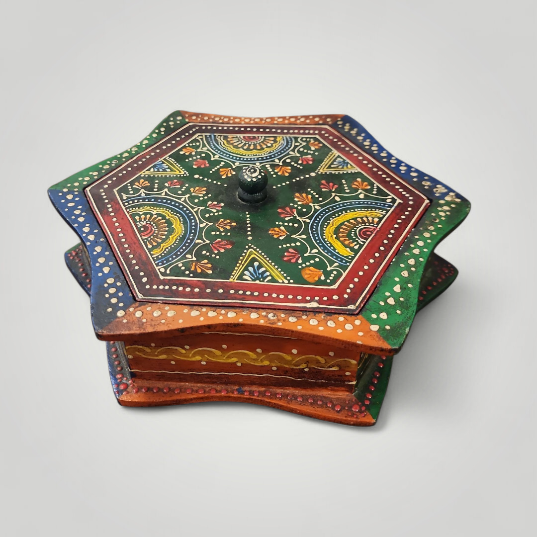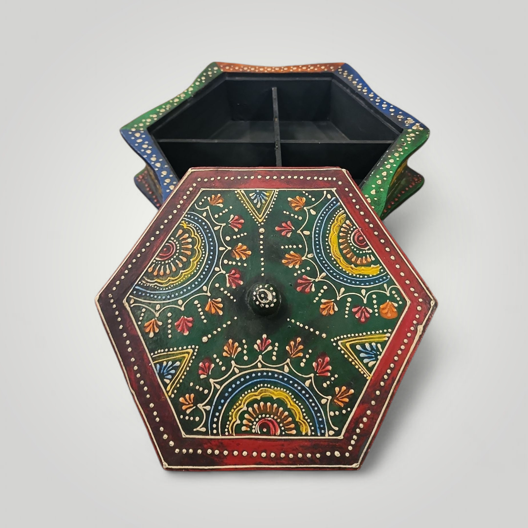 Add a splash of color and culture to your space with this exquisitely handpainted wooden star-shaped box. Crafted by skilled artisans, this vibrant box features four internal compartments, perfect for storing dry fruits, spices, jewelry, or knick-knacks. Each side is uniquely painted in festive hues with traditional Indian motifs, making it a striking addition to any tabletop or gift collection.